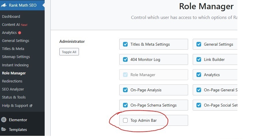 So with that out, instead we thought maybe we can get rid of the admin bar all together. We Google’d how to turn off that admin bar and found the setting which is under RankMatch > Role Manager > Top admin bar. We turned it off, checked, and the code went away!